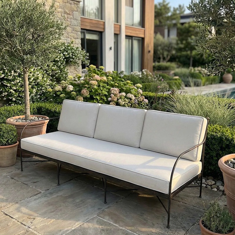 Die zeitlos-eleganten Eisenmöbel vereinen Ästhetik, Langlebigkeit und Zweckmäßigkeit, da sie im Winter nicht drinnen gelagert werden müssen. Um Staunässe zu vermeiden, ist es ratsam, Eisenmöbel nach dem Regen in der Sonne trocknen zu lassen, bevor man sie abdeckt.